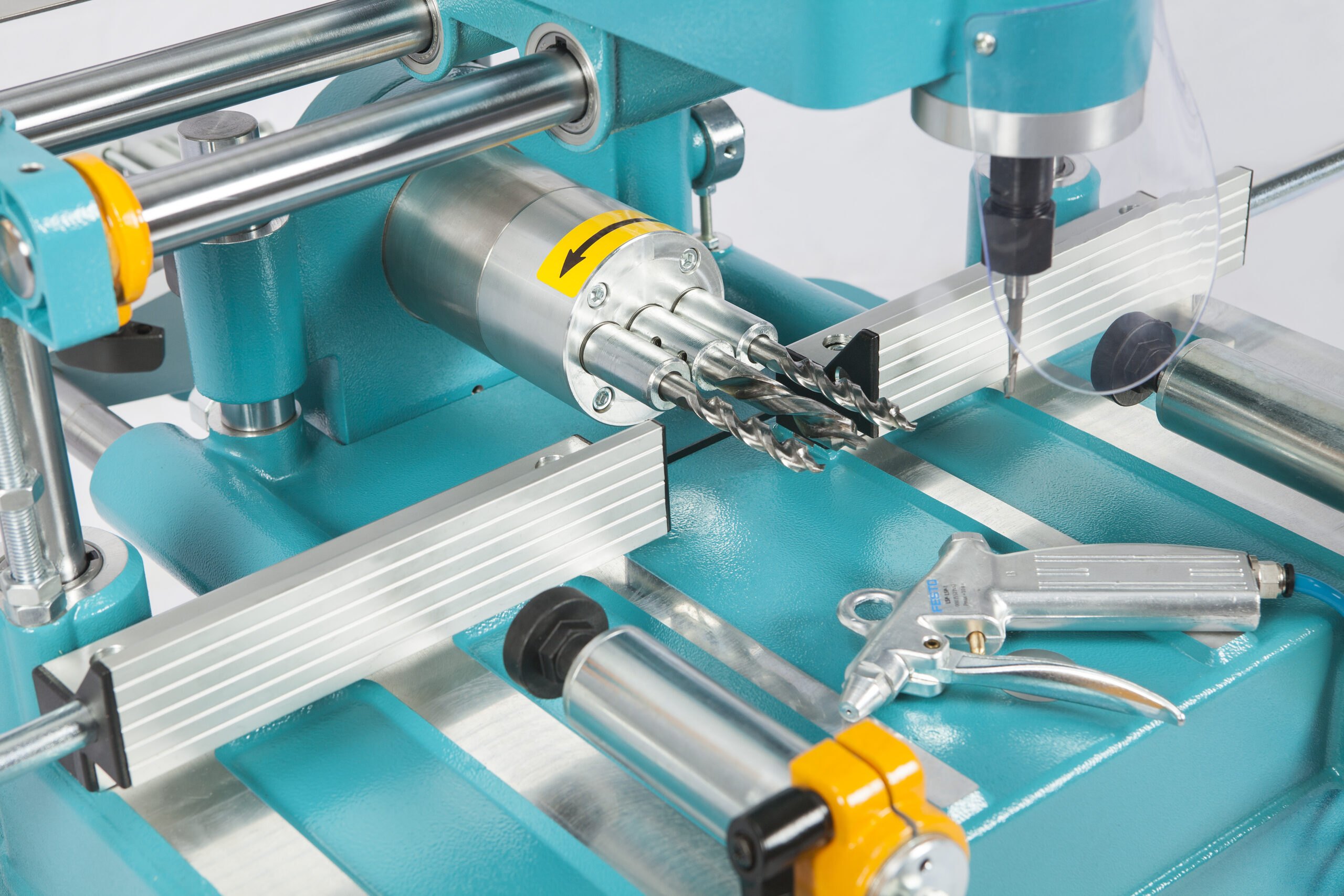 Máquina que se utiliza en los procesos de fresado y la perforación de orificios de ranuras de cilindro, canales de drenaje de agua, bisagras y cerraduras de ventanas y puertas de los perfiles de aluminio y PVC.